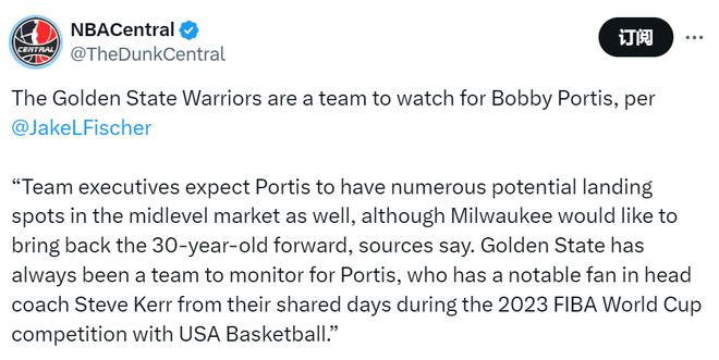 Fischer报道称:“勇士一直是关注波蒂斯的球队,科尔在2023年国际篮联世界杯期间与波蒂斯一同为美国队效力,是波蒂斯的忠实粉丝。”